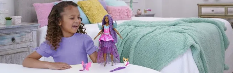 Denne Barbie-Dukke Kan Kun Beskrives Som Magisk Med Sit Lange Fantasihår Og Sin Glitrende Kjole. Barbie ‘Brooklyn’ Roberts-Dukken Er Iført Et Glitrende Outfit Inspireret Af Sit Look I Barbie A Touch Of Magic. To Kæledyr Og Stylingtilbehør Gør Legen Endnu Sjovere! Dukken Kan Ikke Stå Af Sig Selv. Farver Og Mønstre Kan Afvige Fra Det Viste.