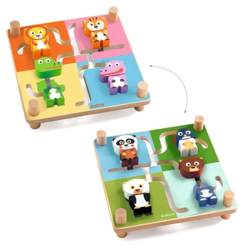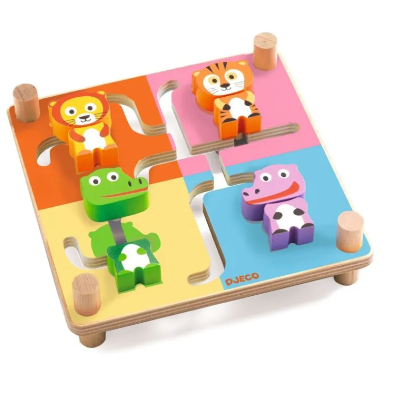 Her Gælder Det Om At Få Samlet De 4 Dyr I Hvert Sit Rigtige Hjørne. Hvert Dyr Består Af To Dele, Der Skal Føres Sammen Det Rigtige Sted. Når De 4 Dyr Er Samlet Korrekt, Vender Du Den Om, Om 4 Nye Dyr På Bagsiden Trænger Nu Til At Blive Sat Rigtig Sammen. Og Sådan Kan Man Blive Ved I En Uendelighed. Et Sjovt Motorisk Og Udfordrende Spil Fra Djeco.