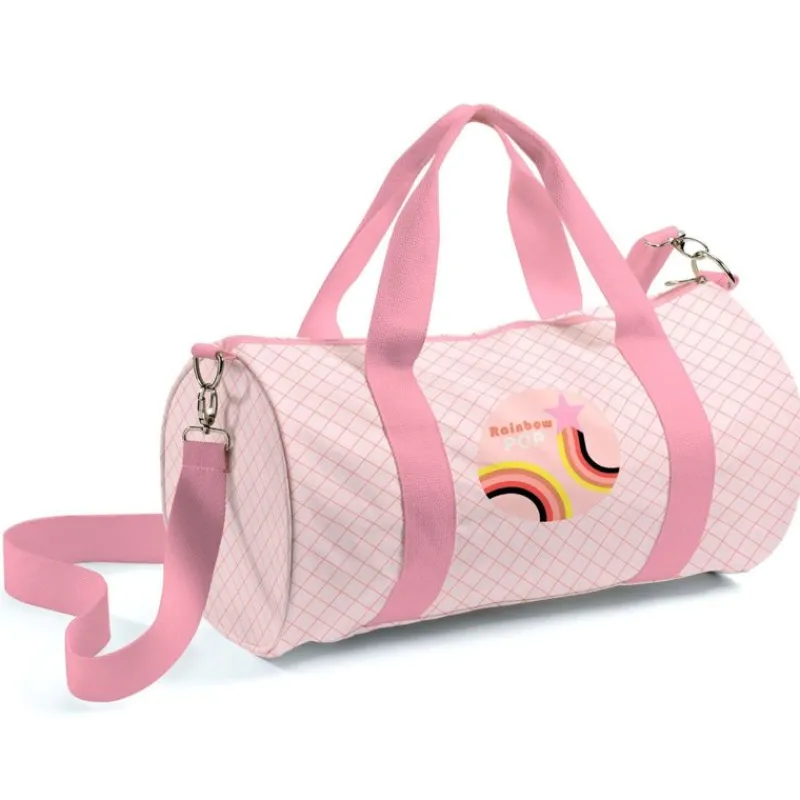 Fin Lyserød Pølsetaske Fra Djeco Med Et Skønt Regnbue Motiv. Tasken Har Bærehåndtag Og En Praktisk Skulderrem Der Kan Justeres Eller Afmonteres Hvis Det Bliver Nødvendigt. Fin Taske Til Gymnastik Eller Pyjamas Party.