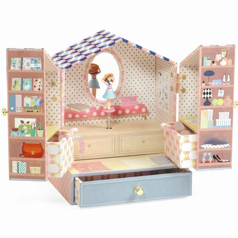 Et Sødt Og Sjovt Smykkeskrin Fra Djeco. Skrinet Er Udformet Så Det Ligner, At Du Åbner Op Til En Lille Butik. Inde I Skrinet Står Tinou Klar Til At Danse Rundt Foran Spejlet, Når Du Trækker Musikken Op. I Skufferne Og På Hylderne Er Der Plads Til Dine Smykker. Melodi: “The Magic Flute”, Wolfgang Amadeus Mozart.
