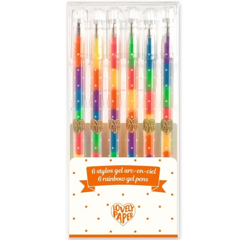 En Sjov Pakke Med 6 Gelpenne I Regnbuefarver. Hver Pen Har 6 Farver, Der Skifter Efterhånden Som Den Bruges (Gul, Orange, Lilla, Grøn, Blå Og Pink).