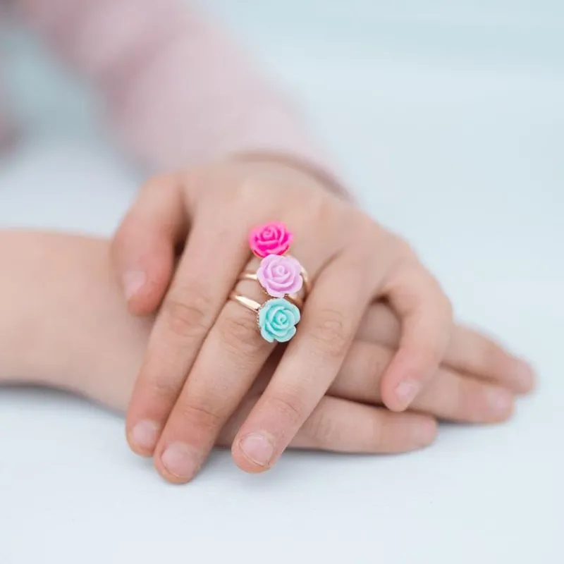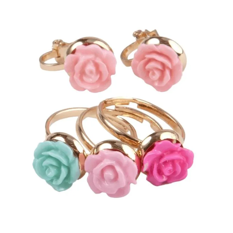 Smukt Sæt Med 3 Guldfarvet Fingerringe Med En Rose På Hver I Lyserød, Pink/Lilla Og Blå. Ringene Er Justerbare, Og Kan Udvides Og Klemmes, Så Den Passer Om Barnets Finger. Til Ringene Hører Der Et Sæt Øreringe Til, Med Lyserøde Roser.