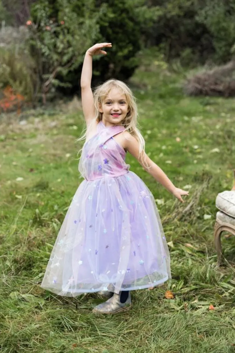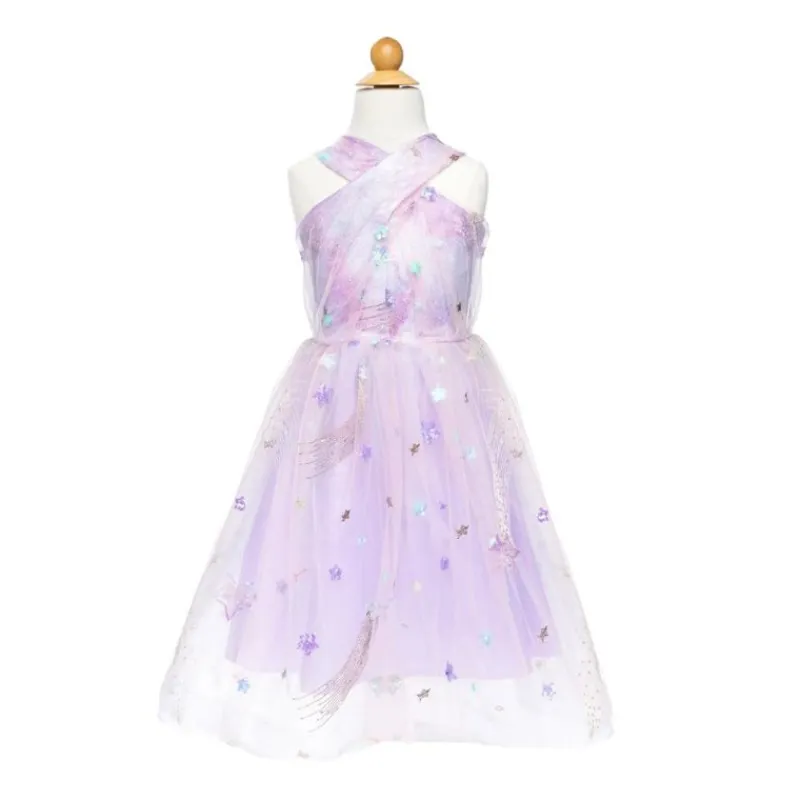Udsmykket Med En Konstellation Af Stjerner, Tilføjer Denne Kjole Et Strejf Af Himmelsk Charme Til Enhver Lejlighed. De Lilla Nuance Bringer Et Blødt Og Elegant Præg, Mens Toppen Med Krydsbånd Tilføjer Et Legende Og Stilfuldt Element.