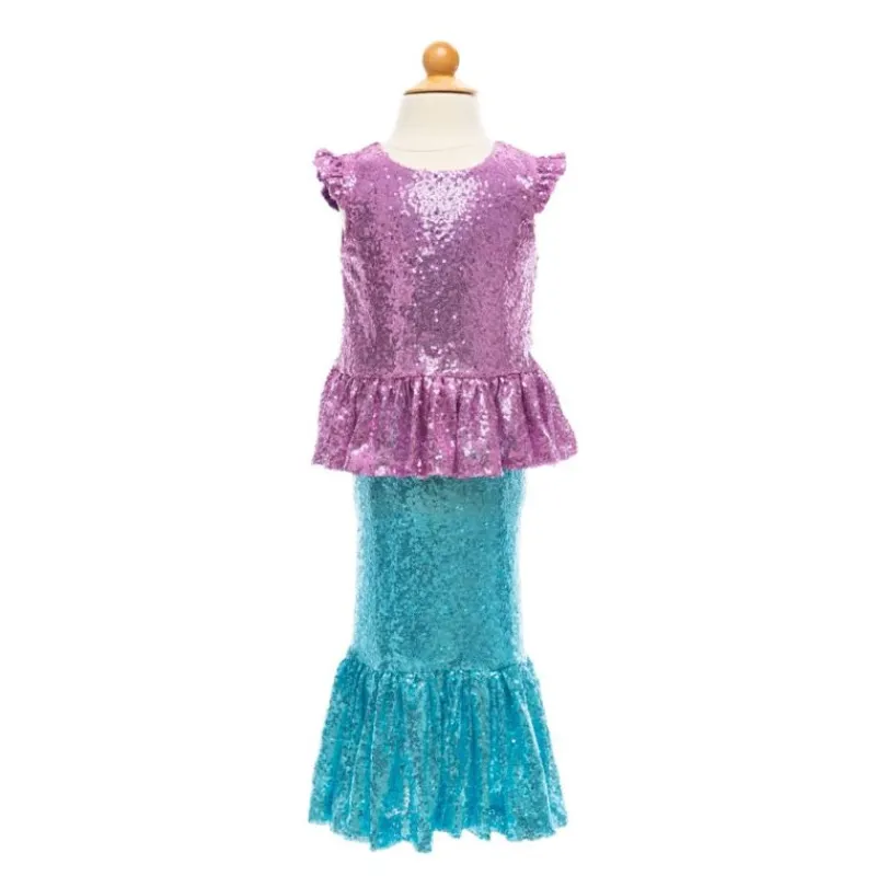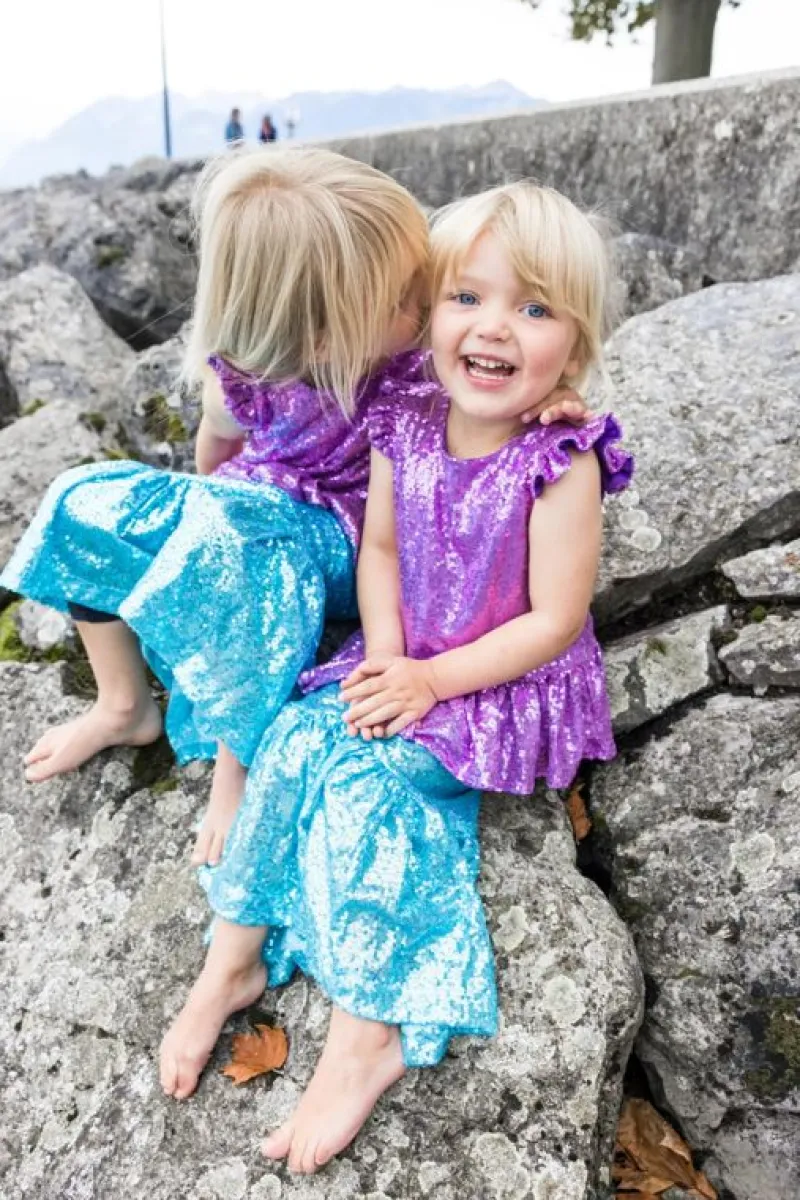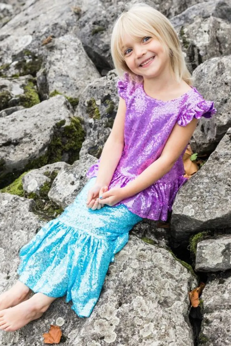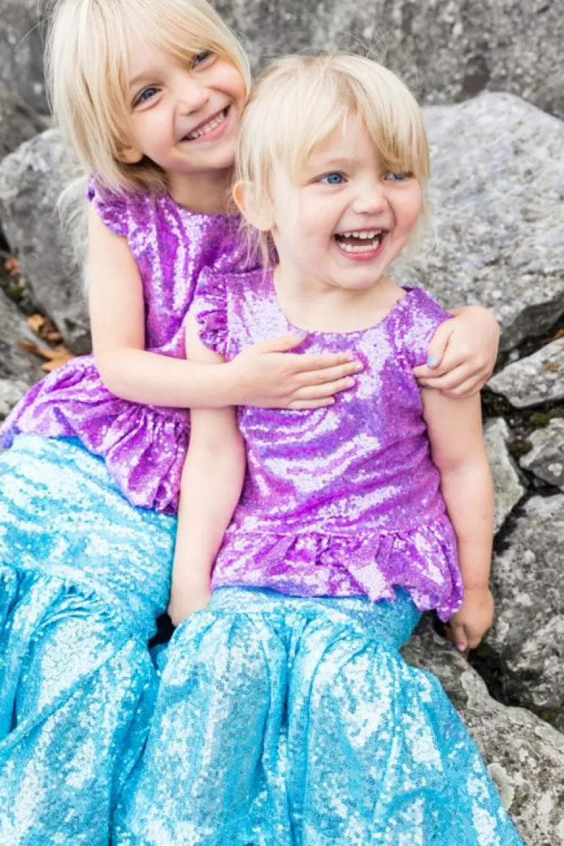 Svøm Skinnende Gennem Havet Med Vores Nye Pailletter Havfrue-Glimmer Top- Og Nederdelsæt. Peplum Paillettet Toppen Er Lavet Af Tusindvis Af Fantastiske Lilla Pailletter Og Har En Lynlås I Ryggen. Havfrue-Silhuet-Nederdelen Har Smukke Himmelblå Pailletter Med En Elastisk Linning. Dette Sæt Vil Helt Sikkert Slå Til!