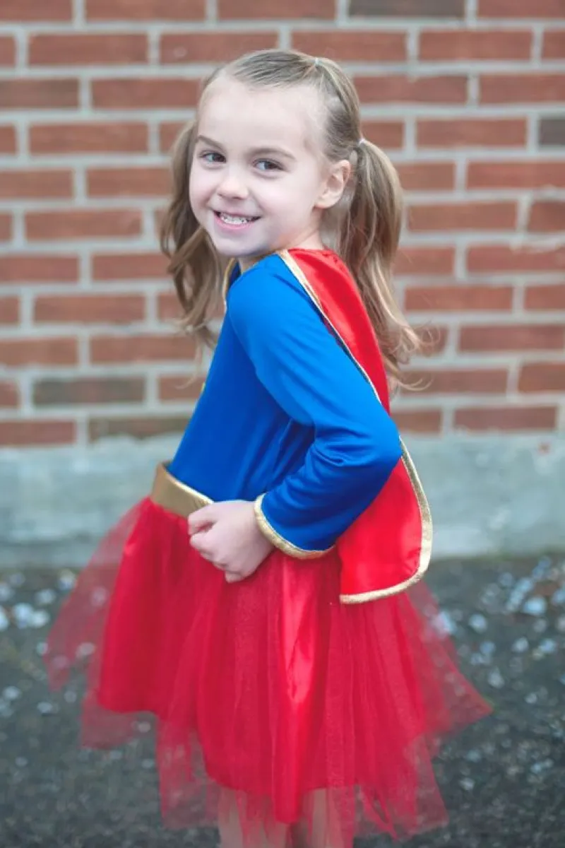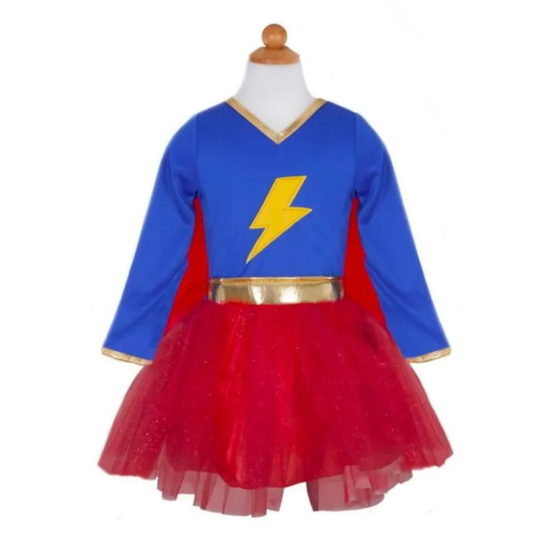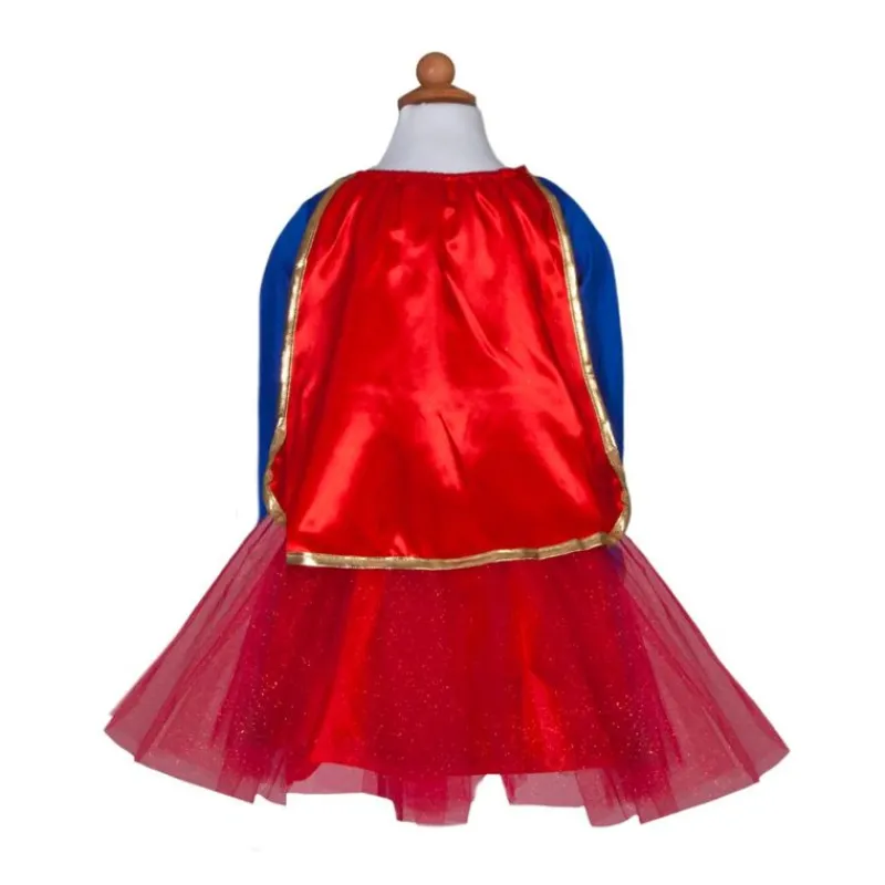 Dette Seje Superheltesæt Har En Blå Spandex-Top Med Guldkant Og Et Filtlyn – Flere Lag Af Funklende Rød Tyl Gør Nederdelen Superfyldig. Kjolen Er Pyntet Med Et Guldbælte Og Selvfølgelig Påsat En Rød Og Guld Kappe.