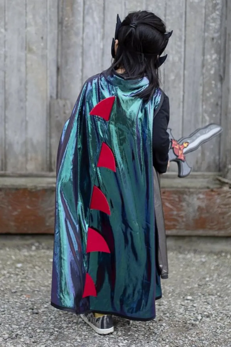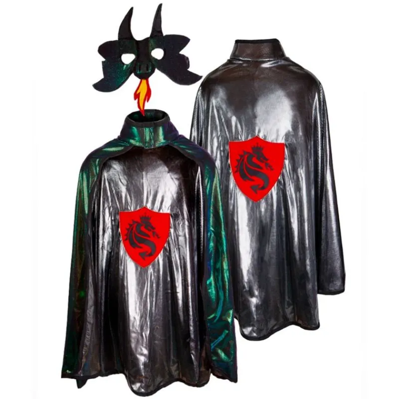 Denne Fantastiske Vendbare Drage-Ridderkappe Med En Maske Ligner Flydende Metal! Den Er Lavet Med Smukt Kvalitetsstof, Der Føles Meget Silkeagtigt Og Har Iriserende Metallisk Folieprint På Den Ene Side, Og Sølv/Sort Folieprint På Den Anden. Der Er Røde Filtpigge På Dragesiden Og Et Rødt Skjoldemblem På Riddersiden. Dobbeltlagsmasken Har Fløjl, Røde Og Gule Filtflammer, Der Kommer Fra Munden For En Super Cool Effekt. Denne Kappe Er Et Rigtig Flot Design Med Dens Pansereffekt På Den Ene Side Og En Flammende Drage På Den Omvendte Side. Den Kan Maskinvaskes Og Meget Nem At Tage På Og Af Med Sin Velcrolukning.