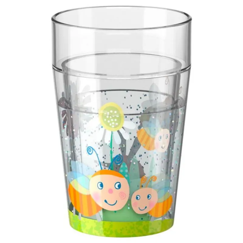 Fin Drikkekop Med Vand Og Glimmer I Mellem De To Lag Af Glasset. Det Er Lavet Bpa-Fri Plastik, Og Er Printet Med Søde Bier