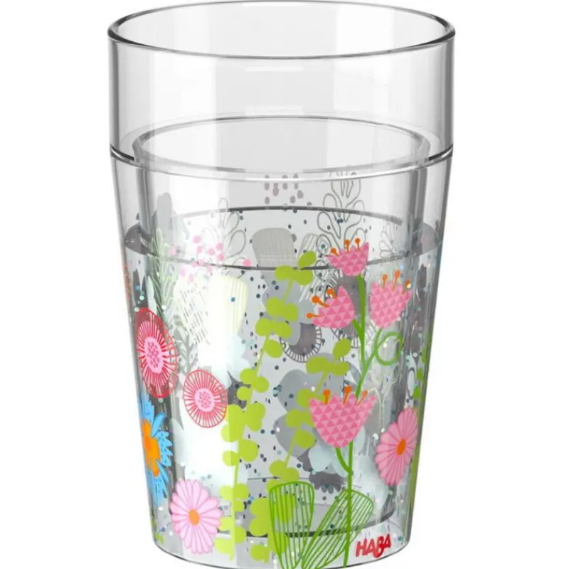 Fin Drikkekop Med Vand Og Glimmer I Mellem De To Lag Af Glasset. Det Er Lavet Bpa-Fri Plastik, Og Er Printet Med Søde Blomster.