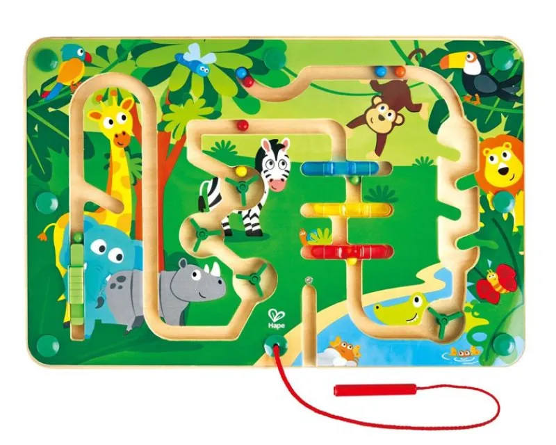 Sving Ind I Hape’S Magnetiske Jungle Labyrint Og Flyt Magnetkuglen Rundt. Brug Den Vedhæftede Stav Til At Diagere Kuglen Rundt I Labyrinten. Langs Den Farverige Labyrint Er Der Forskellige Dyr, Som Indikerer Hvor Langt Inde I Labyrinten Kuglen Er. Små Drejbare Døre Og Kringlede Hjørner Udvider Sjove Og Tilføjer Sjove Historiefortællingselementer. Du Kan Vippe Brættet Eller Bruge Staven Til At Lede Magnetkuglerne Gennem Labyrinten Ad Stier, Hjørner Og Roterende Døre! Labyrinten Er Fantastisk Til At Udvikle Farvegenkendelse, Hånd-Øje-Koordination Og Problemløsningsevner. Hape’S Labyrint Er Lavet I Et Letvægtsmateriale, Der Er Let At Bære Rundt, Så Eventyret Kan Udfolde Sig Hvor Som Helst.