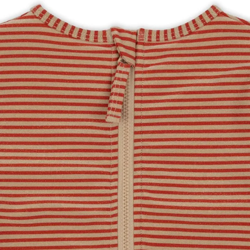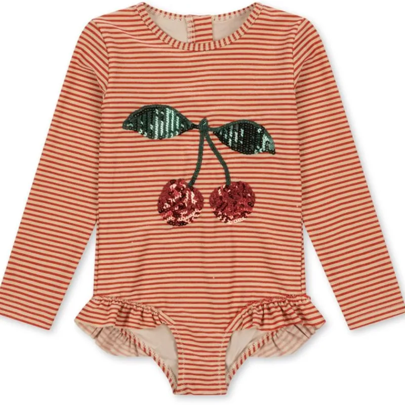 Langærmet Badedragt Med Søde Flæsedetaljer I Det Finest Glitrende Stof. Lukkes Med Lynlås I Nakken. Der Er Trykknapper I Bunden Op Til 18 Måneder.