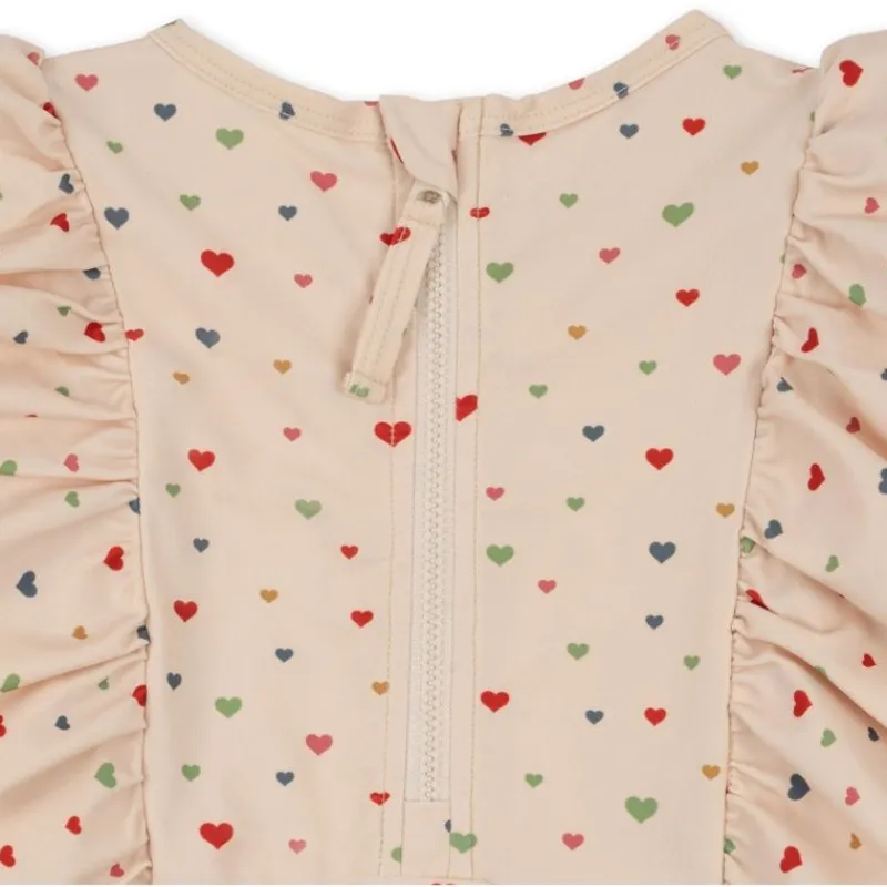 Langærmet Uv-Svømmedragt Med Søde Flæsedetaljer I Det Fine Hjerte-Print. Lukkes Med Lynlås I Nakken. Det Elastiske Stof Beskytter Mod Solens Uv-Stråler Med Den Højeste Ultraviolette Beskyttelsesfaktor, Upf 50+.