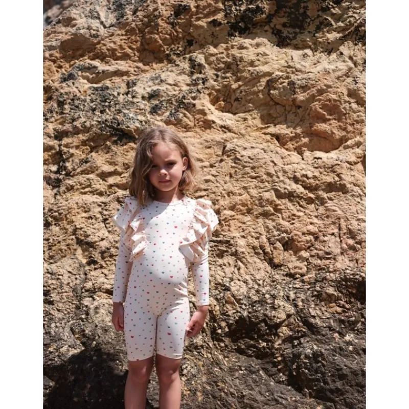 Langærmet Uv-Svømmedragt Med Søde Flæsedetaljer I Det Fine Hjerte-Print. Lukkes Med Lynlås I Nakken. Det Elastiske Stof Beskytter Mod Solens Uv-Stråler Med Den Højeste Ultraviolette Beskyttelsesfaktor, Upf 50+.