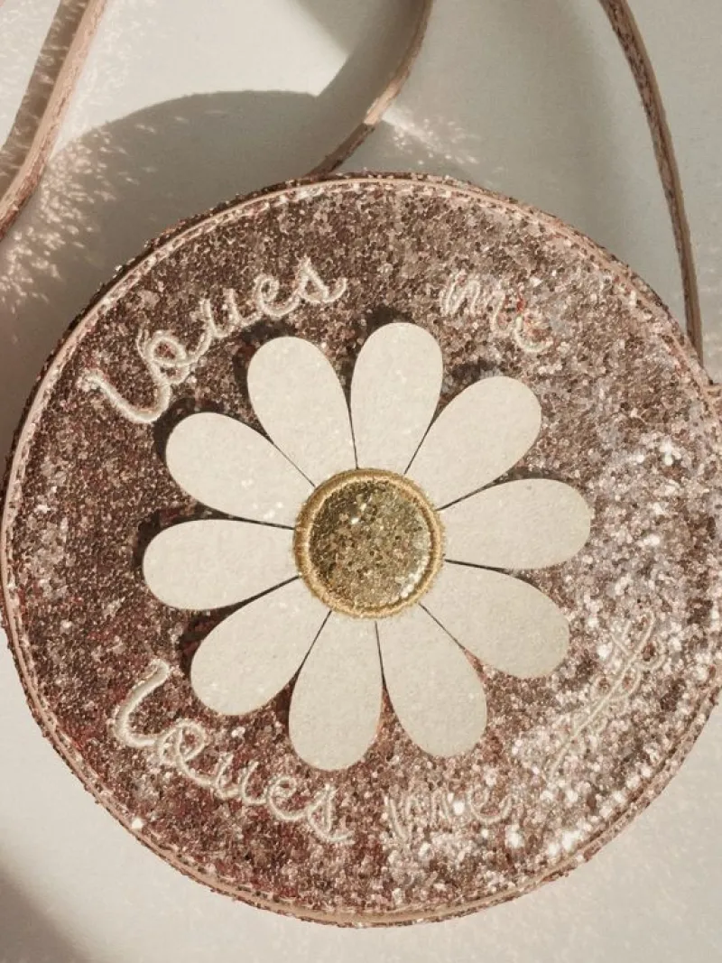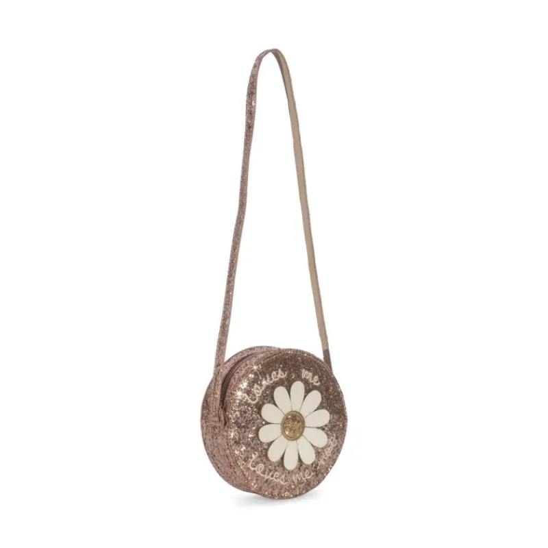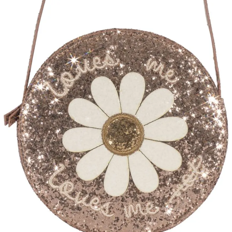 Sød Skuldertaske Med Lang Strop Fra Konges Sløjd. Den Er Glitrende Og Med En Sød Daisy Blomst. Lukkes Med Lynlås.