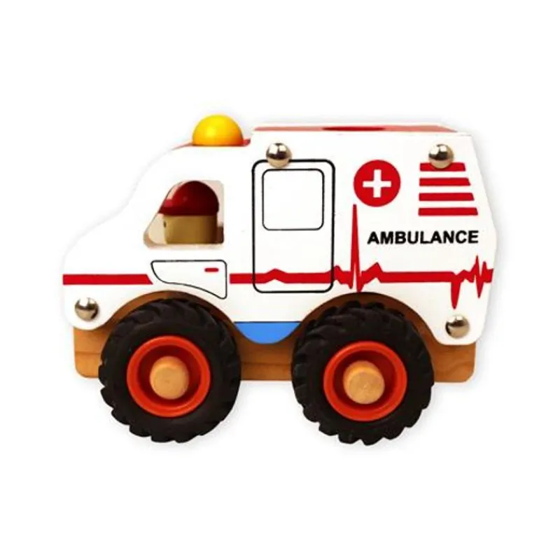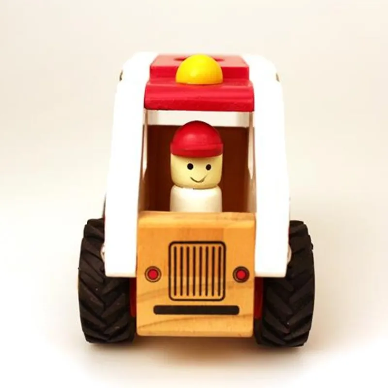 Ambulance I Træ Med Gummihjul. I Ambulancen Sidder En Træfigur. Findes Også Som Politibil, Skraldebil, Traktor Og Brandbil.