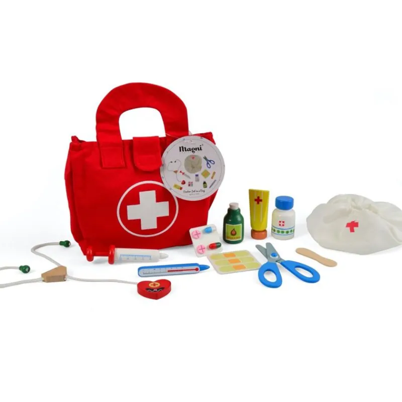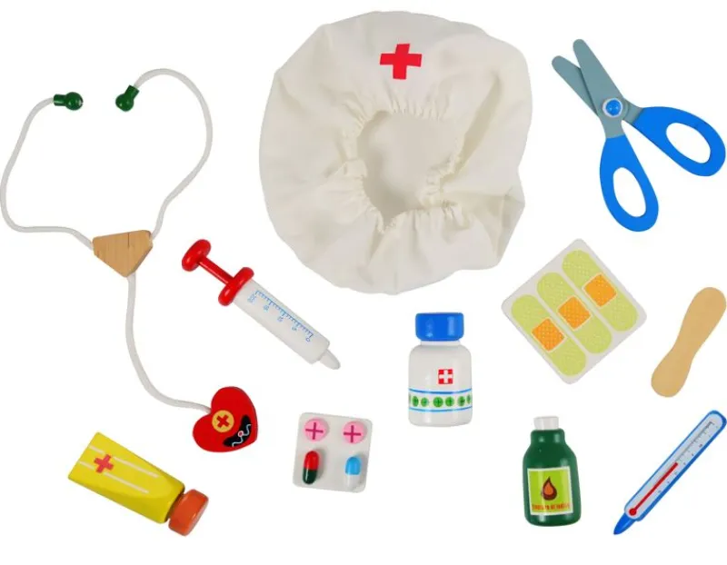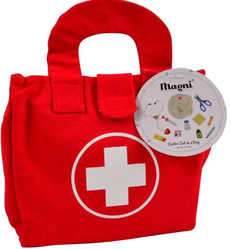 Doktortaske Med Alt Doktorudstyr Barnet Får Brug For, Når Bamser Og Dukker Skal Have En Hjælpende Hånd. Indeholder 11 Dele: Tunge Spatel, Saks, Termometer, Stetoskop, Kanyle, Gaze, Plaster, Medicin Og Sygeplejerskehat, Og Alt Kommer I En Rød Doktortaske.