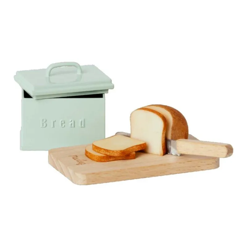 Dette Miniature Legesæt Består Af En Brødæske, Halvt Brød Og 3 Skiver, Et Skærebræt Og En Kniv. Det Er Lavet Af Metal, Træ Og Polyresin. Det Er Den Perfekte Start På Et Leg I Miniaturekøkkenet.
