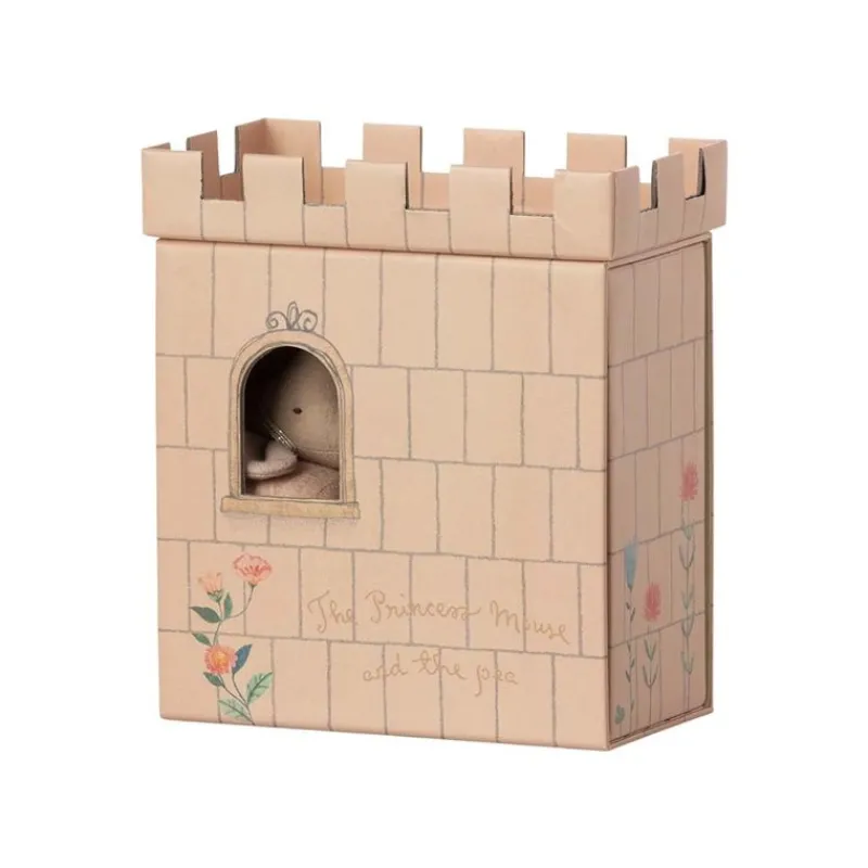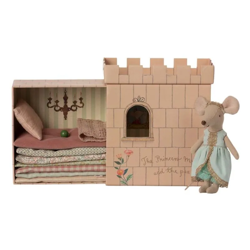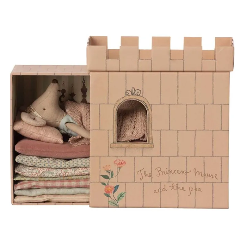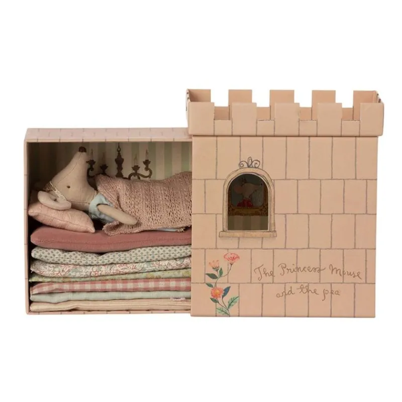 Skøn Prinsessen På Ærten Mus Med Et Smukt Dekoreret Slot, Flere Farverige Madrasser, Pude Og Tæppe, En Ært Og En Smuk Prinsesse Mus Med Lyserød Kjole Og Prinsessekrone.