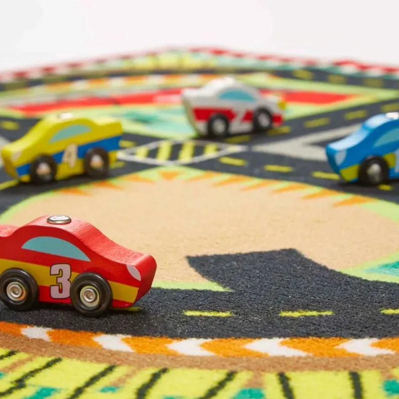 Racetema Tæppe, Fra Melissa &Amp; Doug, Med 4 Biler Med Tal På.