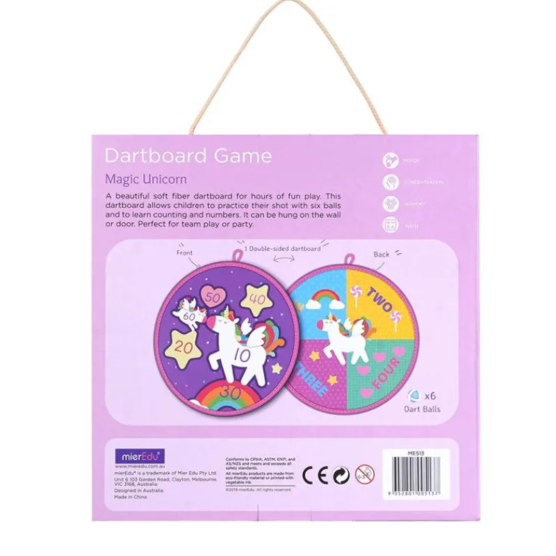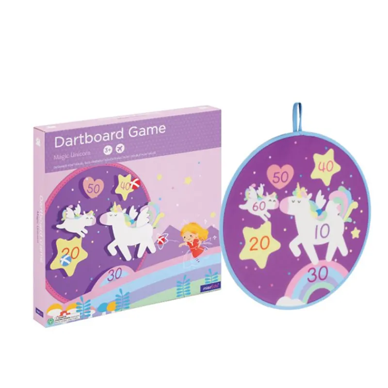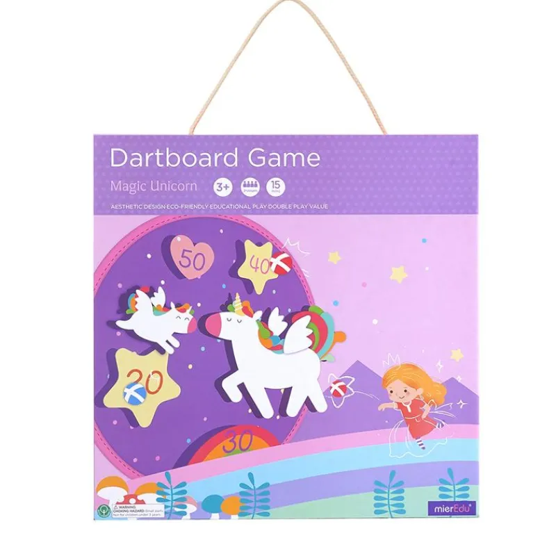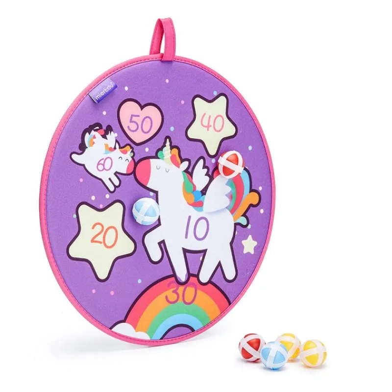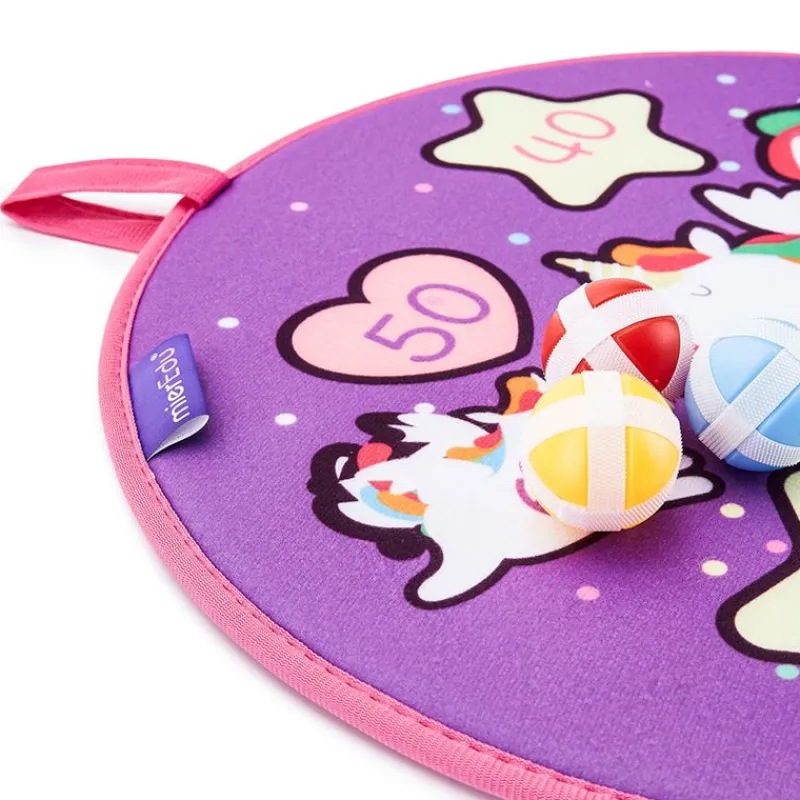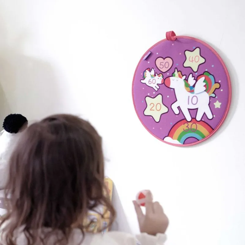 Et Lækkert Dartspil Med Enhjørning-Tema, Blød Fiberskive Og 6 Velcrobolde, Giver Børn Mulighed For At Øve Deres Skud Og Lære Tal Og Tællefærdigheder.