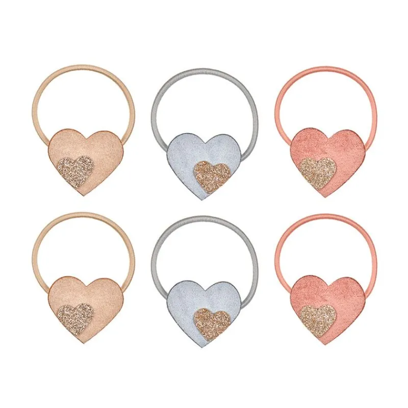 3 Par Hårelastikker Med Glitter-Effekt Hjerter I Natur, Blå Og Pink.