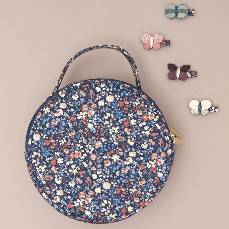 Rund Skuldertaske Med Strop, Bærehåndtag Og Lynlås. Tasken Er Dekoreret Overalt Med Et Flot Blomstermotiv.