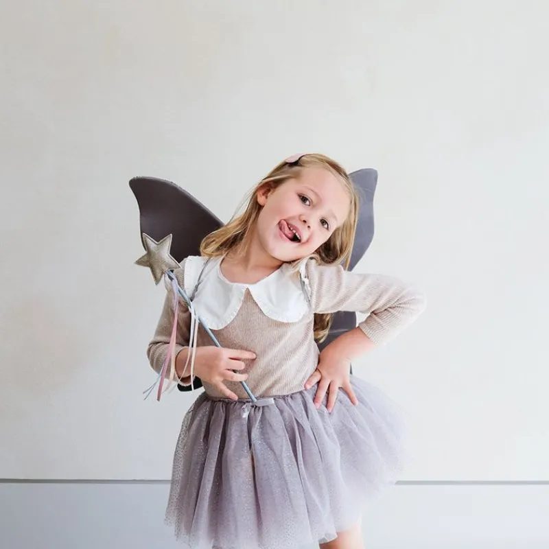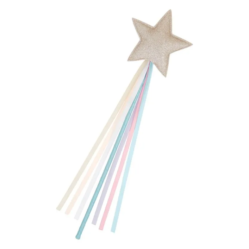 Spred Stjernestøv Med Denne Fine Tryllestav, Hvor Stjernen Er Polstret Med Glitter Og Har 6 Smukke Satinbånd Hængende Fra Stjernen Og Ned. Stjernen Er Placeret Sikkert På En Pind, Betrukket Med Satinbånd.