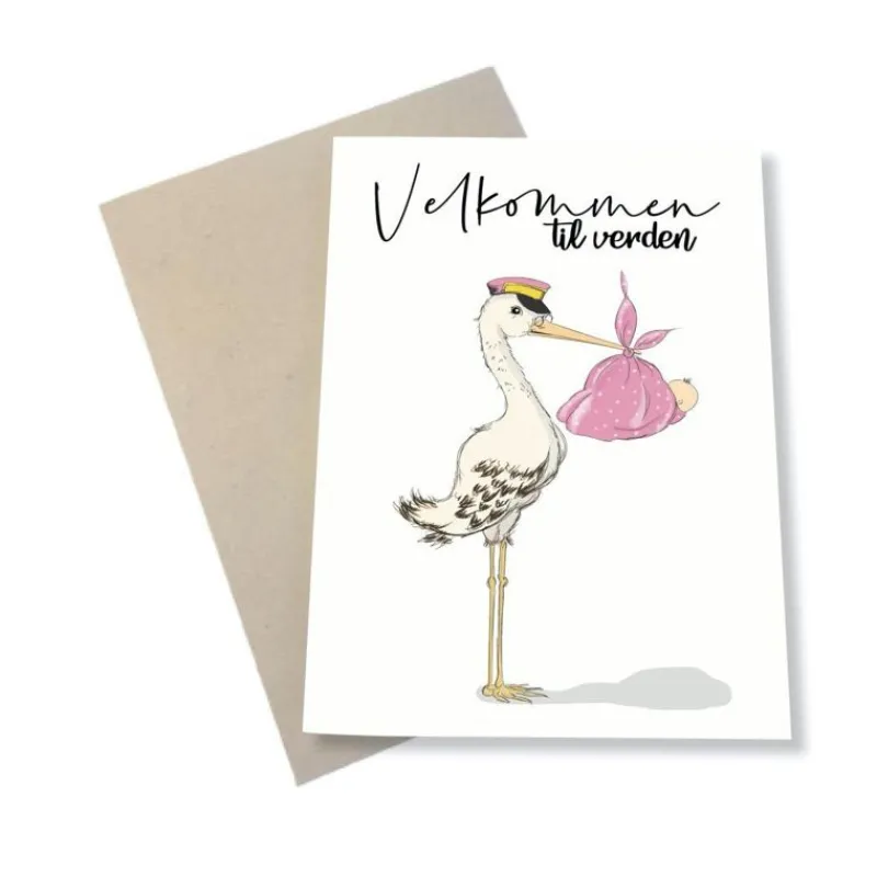 Dette Festlige Og Pæne Kort Pynter Til Enhver Gave, Kurv Eller Blomst. På Kortet Er Der Tegnet En Stork, Som Holder En Baby I Lyserødt Svøb Med Teksten “Velkommen Til Verden”. Kortet Måler A6 (11,5 X 16Cm.), Og Er Blankt Indeni Med Plads Til Masser Af Tekst.