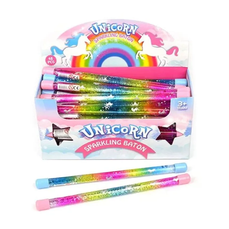Smuk Og Farverig Tryllestav Med Vand Og Glimmer. På Siderne Er Der Flotte Enhjørninger, Som Glimter På Tryllestavens Overflade.