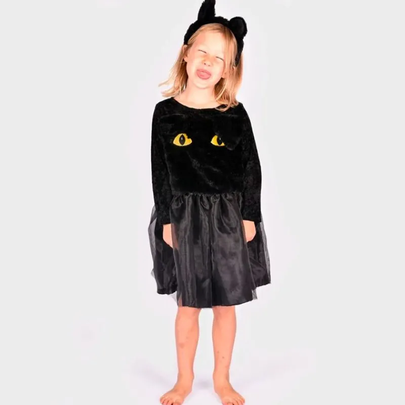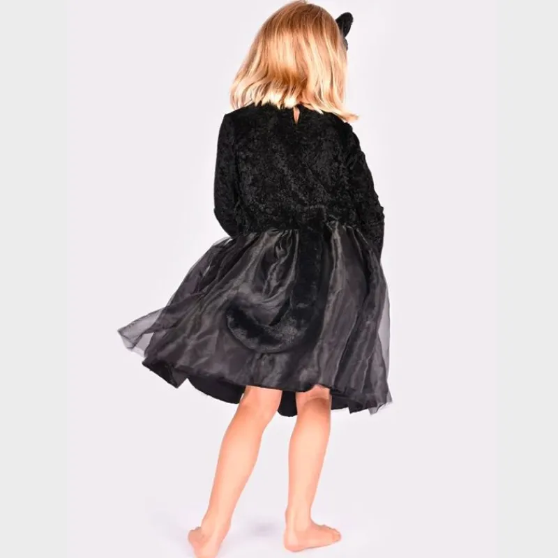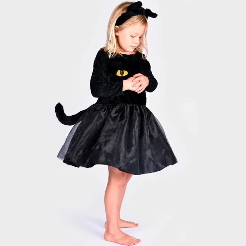 Sort Kattekjole Med Tutu-Nederdel. Top Lavet Af Fløjl Og Korthåret Plysstof. Hale På Ryggen Og Ører På Brystet. Hårbøjle Med Ører I Korthåret Plysstof.