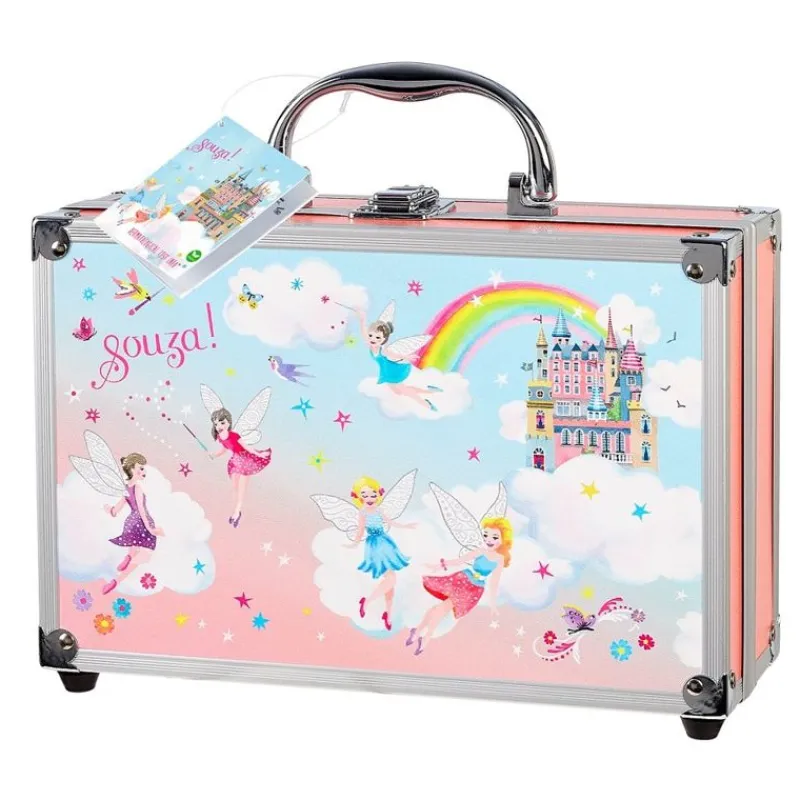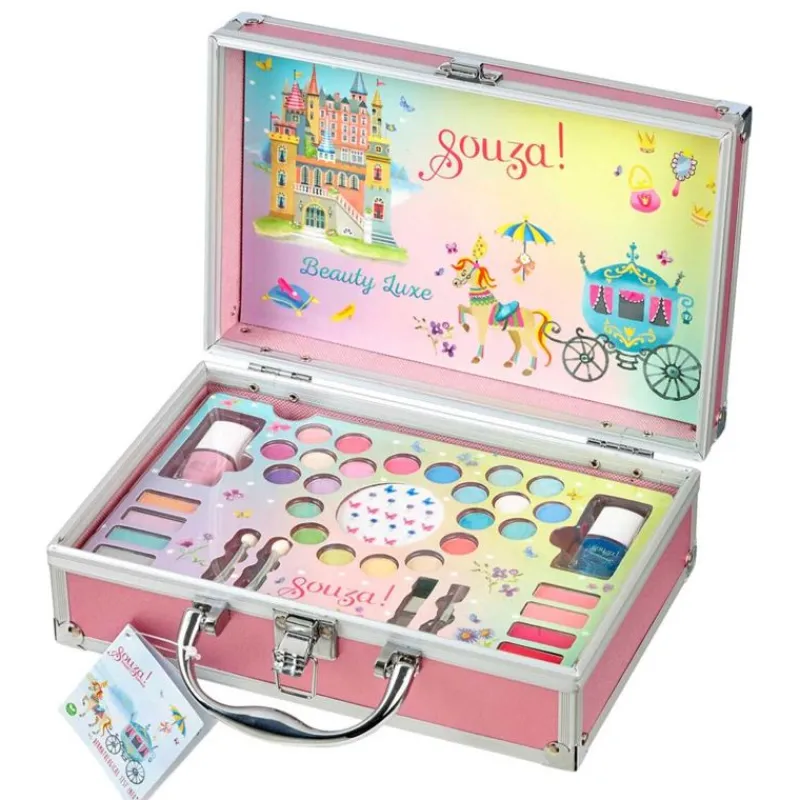 Kuffert Med Make-Up Sæt Som Indeholder Forskellige Farver Øjenskygge, Lipgloss, Blush, Neglelak Og Masser Af Glimmer.