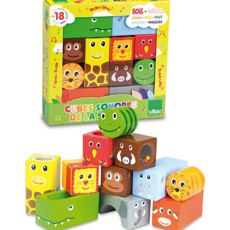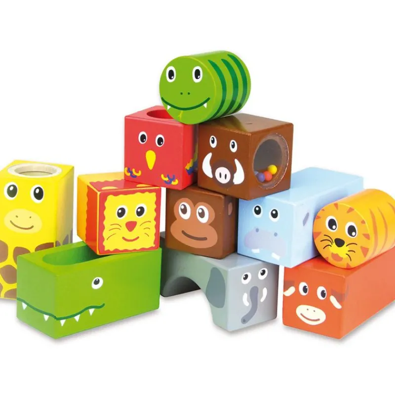 Et Sensorisk Legetøj Med Raslelyde At Gå På Opdagelse I. Hver Af De 11 Træklodser Er Udformet Som En Klassisk Stableklods Og Malet Som Et Dyr.