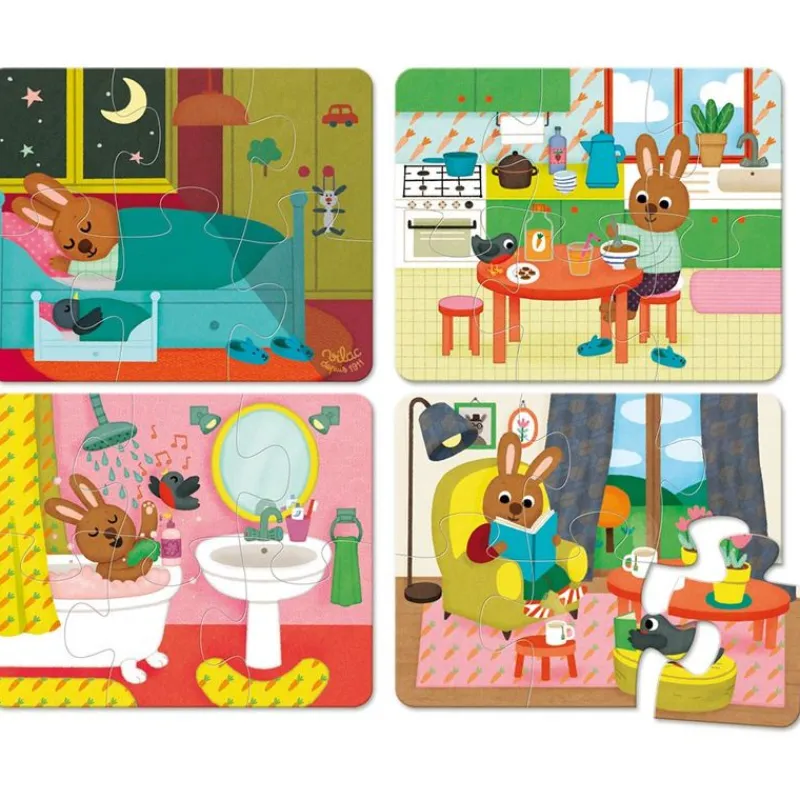 Puslespil I Træ Med Fire Scener Fra Hjemmet.Den Lille Kanin Sover I Sin Seng, Spiser Morgenmad, Tager Et Brusebad Og Læser En God Historie.Pakket I En Praktisk Trææske Med Snor-Håndtag, Så Det Er Let At Tage Med Sig.4 Forskellige Puslespil, 6 Stykker For Hver Puslespil.Alder: 2+