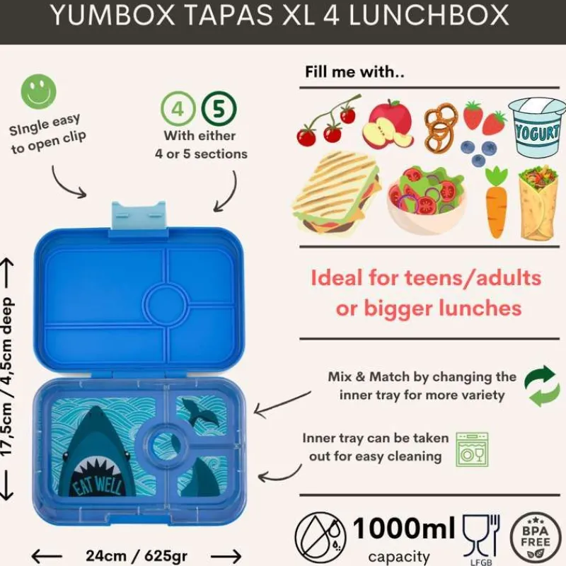 Yumbox Tapas Madkassen Er Ideel Til Lidt Større Børn Eller Børn Der Har Brug For Mere Mad. Den Har Et Stort Rum, Hvor Der F.Eks. Er Plads Til Et Pitabrød, Og 3 Mindre Rum Med Plads Til Frugt Og Grønt Eller Andre Snacks. De 4 Rum, Som Hver Er Forsejlet Af Silikonen Der Sidder I Låget, Gør At Man Nemt Kan Pakke Tyktflydende Væsker Uden Det Flyder Ud I Andre Rum Samtidig Med At Mad Og Frugt Holdes Frisk I Flere Timer.